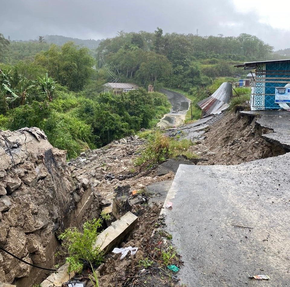 “Baru tadi amblas, tanahnya langsung turun ke jalan. Sekarang tidak bisa dilewati dulu, takut tambah runtuh,” ujar seorang warga berjualan di lokasi.