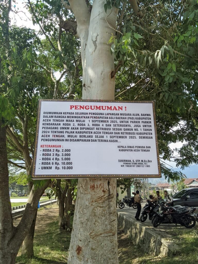 Pengumuman ini disampaikan melalui sebuah spanduk yang terpasang di salah satu pohon di area Musara Alun. Spanduk tersebut bertuliskan “Diumumkan kepada seluruh pengguna Lapangan Musara Alun, bahwa dalam rangka meningkatkan Pendapatan Asli Daerah (PAD) Kabupaten Aceh Tengah, maka mulai 1 September 2025 untuk parkir kendaraan roda 2, roda 3, roda 4 dan seterusnya, juga untuk pedagang UMKM akan dipungut retribusi sesuai Qanun No. 1 Tahun 2024 tentang Pajak Kabupaten Aceh Tengah dan Retribusi Kabupaten Aceh Tengah.”