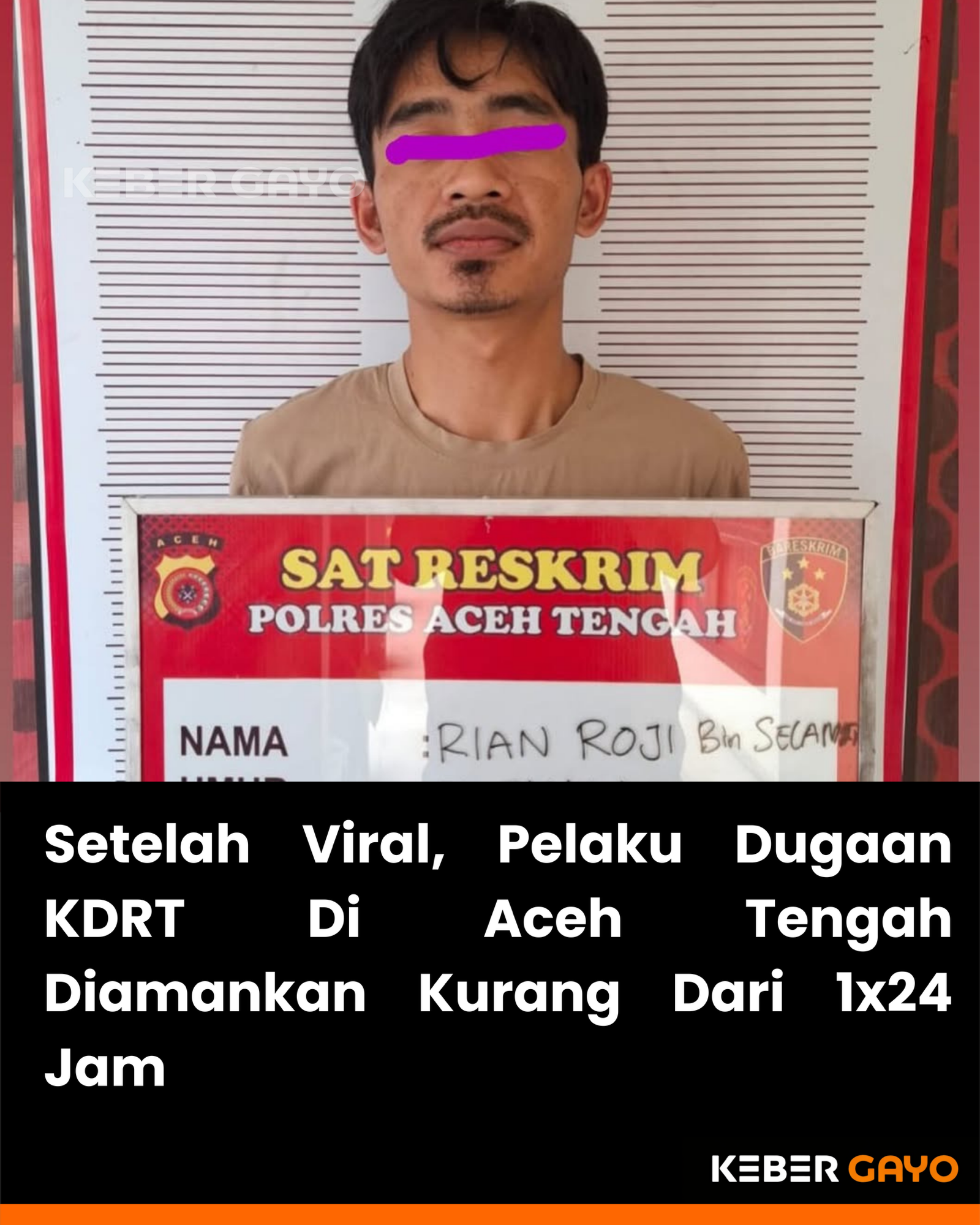 bergerak cepat mengamankan terduga pelaku tindak pidana Kekerasan Dalam Rumah Tangga (KDRT) yang terjadi di wilayah Aceh Tengah. Penangkapan dilakukan dalam waktu kurang dari 1×24 jam setelah laporan dan informasi kejadian diterima.