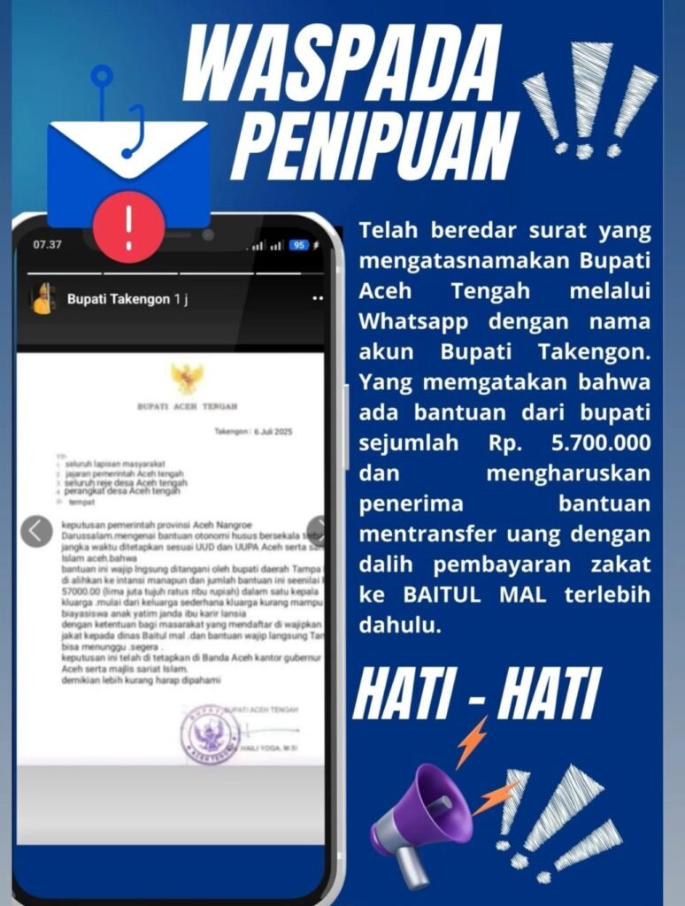 Takengon – Beredar pesan WhatsApp yang mengatasnamakan Bupati Aceh Tengah dengan akun bertuliskan “Bupati Takengon”. Pesan tersebut disertai surat palsu berlogo pemerintah daerah yang menyebutkan adanya bantuan senilai Rp5.700.000 bagi masyarakat.